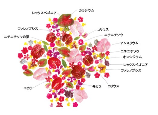 南国のキラキラした太陽を感じさせる色鮮やかな「アンスリウム」を、8種類の花たちとニチニチソウの葉がにぎやかに取り囲み、見ているだけで楽しくなるデザインです。