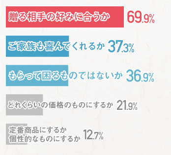 また、「ご家族も喜んでくれるか」、「もらって困るものではないか」も、贈り物を決めるうえで大切にしています。(※上グラフ参照)