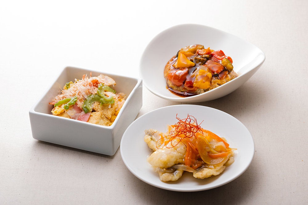 唐揚げとなすの生姜あんかけやベーコンとゴーヤのチャンプルーなど季節の惣菜と、日本橋だし場自慢のだしの効いた煮しめを盛り合わせました。