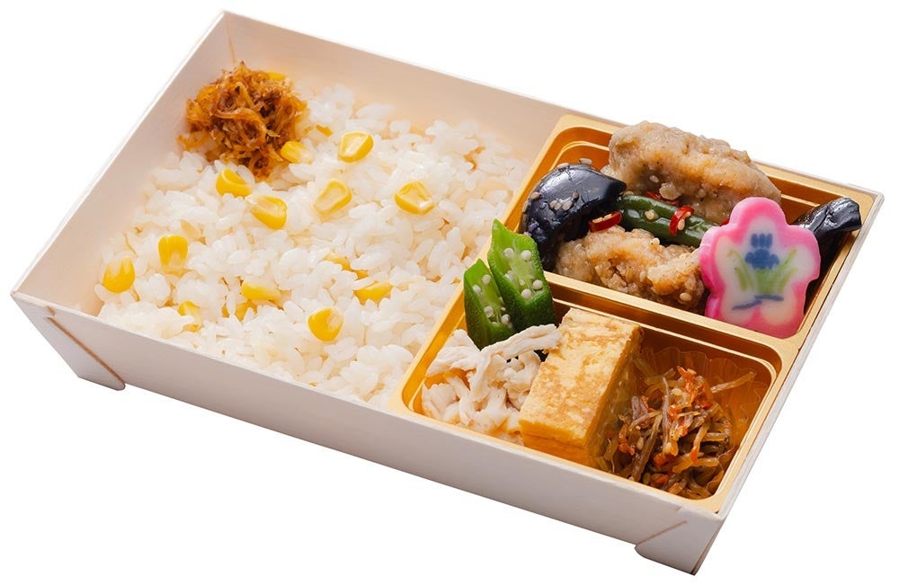とうもろこしやオクラなど、旬の食材を使った夏を感じられるお弁当です。