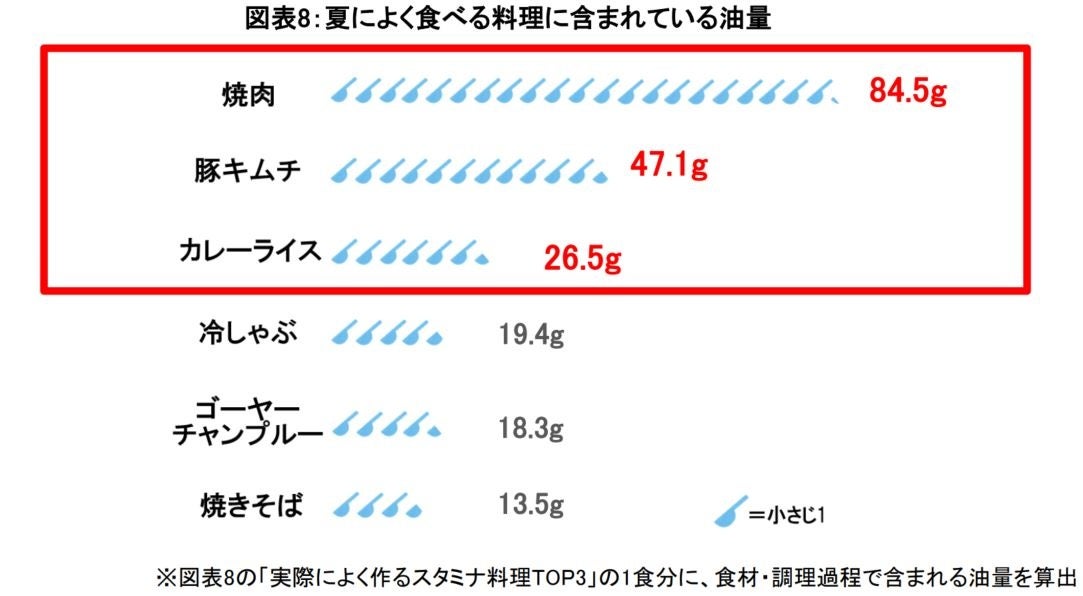・管理栄養士が夏によく食べる料理に含まれている油量を算出したところ、「作りたい料理」のTOP3であるカレー、焼肉、豚キムチなどのスタミナ料理の油量が非常に多いことが浮き彫りになった。
