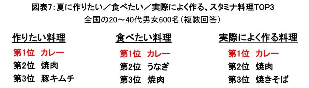 ・夏のスタミナ料理として、「作りたい料理」「食べたい料理」「実際によく作る料理」の3項目で聞いたところ、全てのランキングで1位が「カレー」だった。