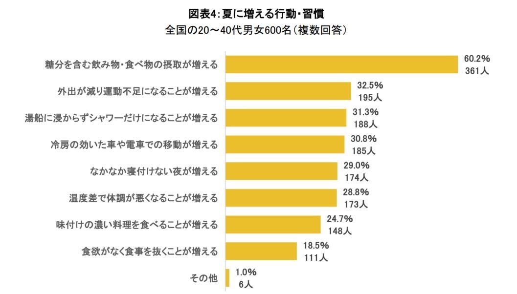 ・夏に増える行動・習慣として、最も回答が多かったのは、「糖分を含む飲み物・食べ物の摂取が増える」で、約6割の人が回答した。
