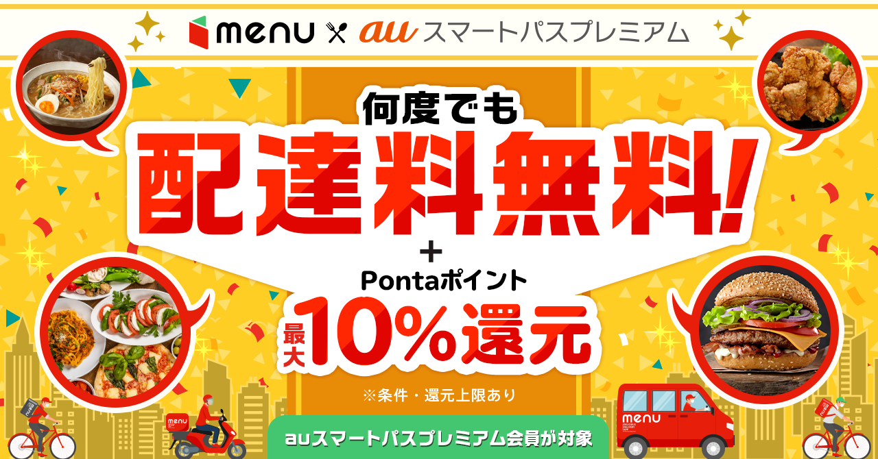 | 概要 | auスマートパスプレミアム会員の方が、menuアプリを利用しお支払いいただくと、デリバリー注文のうち還元対象額(※)の最大10%をPontaポイントで還元します。 ※ご注文金額から、各種割引分(クーポン・menupass・Pontaポイント)を差し引いた金額が、還元対象額となります。還元対象額に応援金、チップは含みません。 |