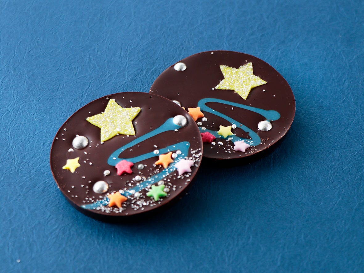 ベルアメールオリジナルのビターチョコに、天の川をイメージした青いラインやカラフルな星などで美しくデコレーション。