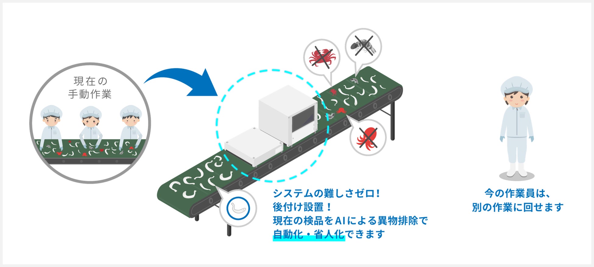 これによって培った経験とお悩みの声をもとに、この度はAIにおける自社プロダクトの第一弾として、水産加工品や農産物の検品作業を省人化する「OKIKAE検査ボックス」を開発することに至りました。