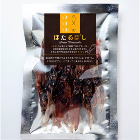 富山湾にて捕獲された「ほたるいか」を能登伝承の魚醤(いしり)を隠し味に使用し、冷風乾燥しました。ほたるいか特有のワタの旨味に薫り深いいしりの旨味をプラスしています。
