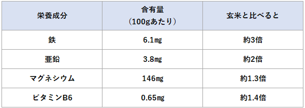 バーリーマックスは食物繊維の他、鉄や亜鉛、ビタミンB6など健康のために必要な成分も豊富で栄養バランスに優れています。鉄分はなんと玄米の約3倍です。[以下参照]