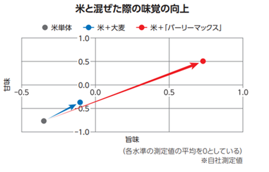 スーパー大麦「バーリーマックス」は、熱に強く、茹でても炊飯しても穀粒がつぶれないため、プチプチした食感が残りやすいです。また、一般的な白米や大麦に比べ、甘味・旨味のレベルが高くおいしさアップに貢献できると考えられています。お米と混ぜたときにも、甘味、旨味が向上しました。