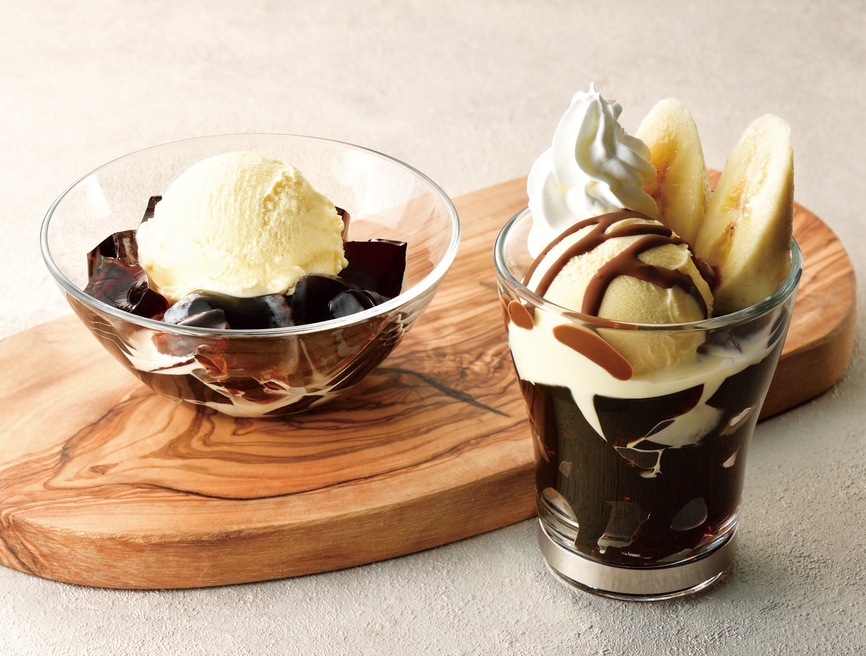 デザートメニュー「自家製珈琲ゼリーパルフェ〜チョコバナナ〜」は各店舗で抽出したアイスコーヒーを使用したオリジナルの珈琲ゼリーに、バニラアイス、ホイップ、チョコレートソース、フレッシュなバナナをあわせた食べ応えのあるパルフェです。珈琲ゼリーのぷるぷる食感に、バニラアイスの冷たさでパリパリに固まるチョコレートソースがアクセントになっています。