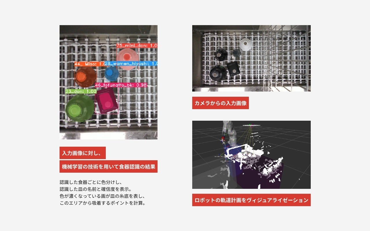 *1 一般的には、ティーチングを行い決められた通りに動く事が通常とされています。同じ食器かつ、同じ姿勢にしか対応できないロボットが多い現状です。