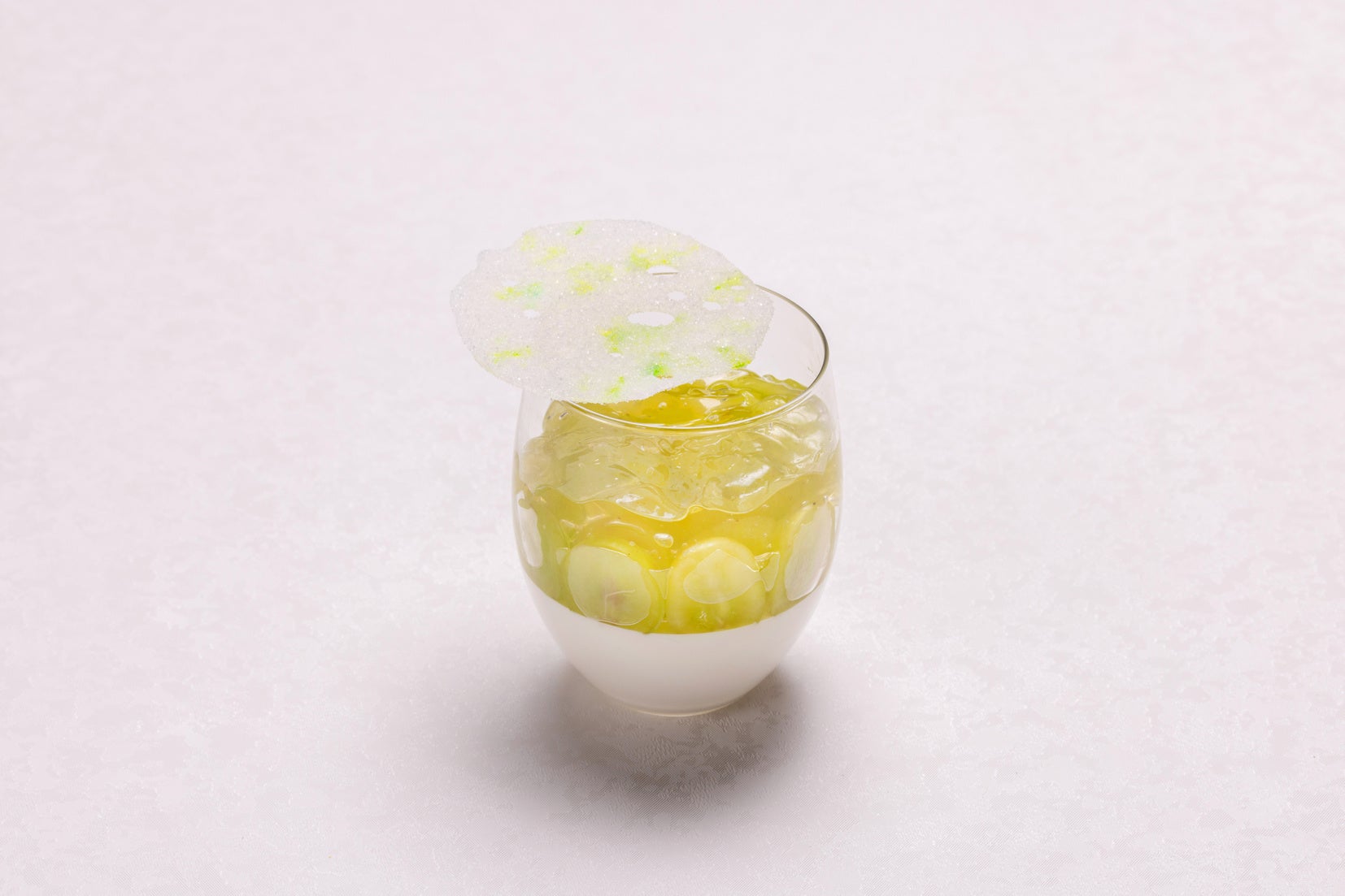 杏仁ムースの上に果粒が大きく果皮の薄いシャインマスカットを断面が見えるようにグラスに並べ、その上からノンアルコール シャルドネスパークリングのジュレをのせたベリーヌです。繊細に飾られた飴細工と一緒にお召し上がりください。