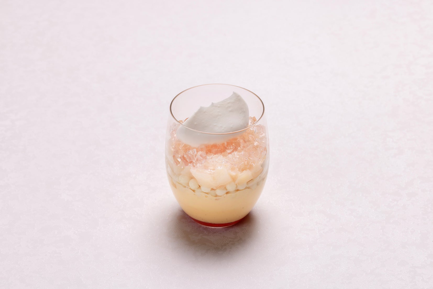 桃をつかった夏らしいプリンです。ベリージュレを敷いたプリンの上にサクサクの食感が楽しめるパールクラッカンを乗せ、その上にダイス型にカットした桃とピーチのジュレ、トップは生クリームでデコレーションいたしました。*アルコール使用
