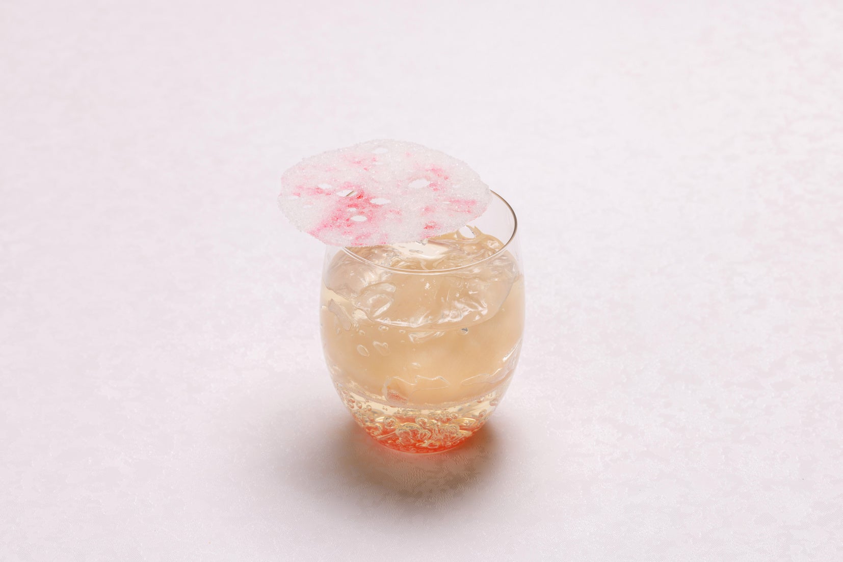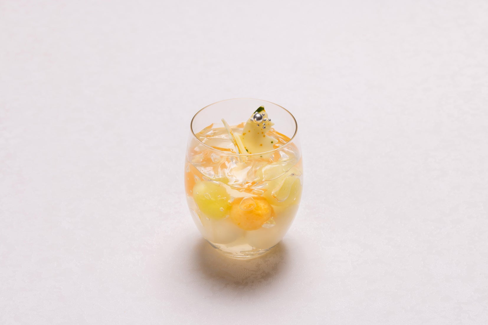 フレッシュな桃にシュワっとしたスプマンテゼリーを合わせました。ピーチの甘味とスッキリとしたスプマンテのジュレが相性のいい、さっぱりとお召し上がりいただける一品です。繊細に飾られた飴細工と一緒にお楽しみください。*アルコール使用