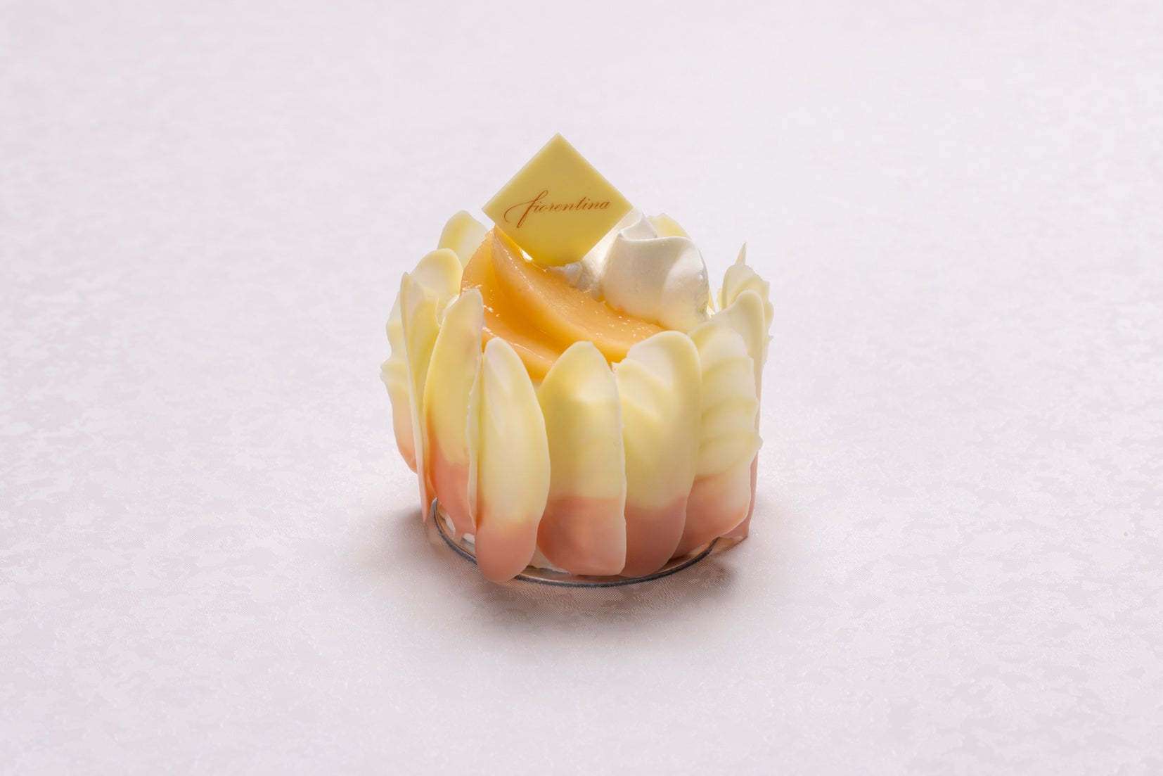旬を迎えるジューシーな桃をケーキの中とトップにたっぷりとつかいました。トップには大きくカットした桃をあしらい、周りは羽根チョコでかわいらしく上品に仕上げています。
