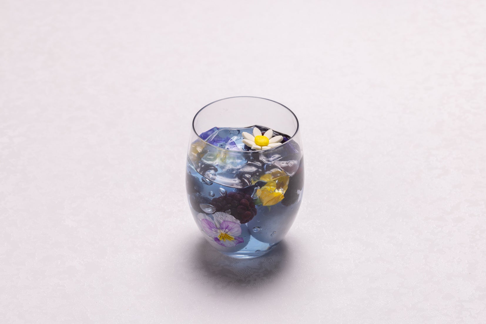 マメ科の植物であるバタフライピーの花からつくる、瑠璃色のゼリーが印象的なグラススイーツには、食べられるお花「エディブルフラワー」とハイビスカスのムースが浮かぶ文字どおり華やかなグラススイーツです。ブルーベリーとブラックベリーの味がアクセントです。