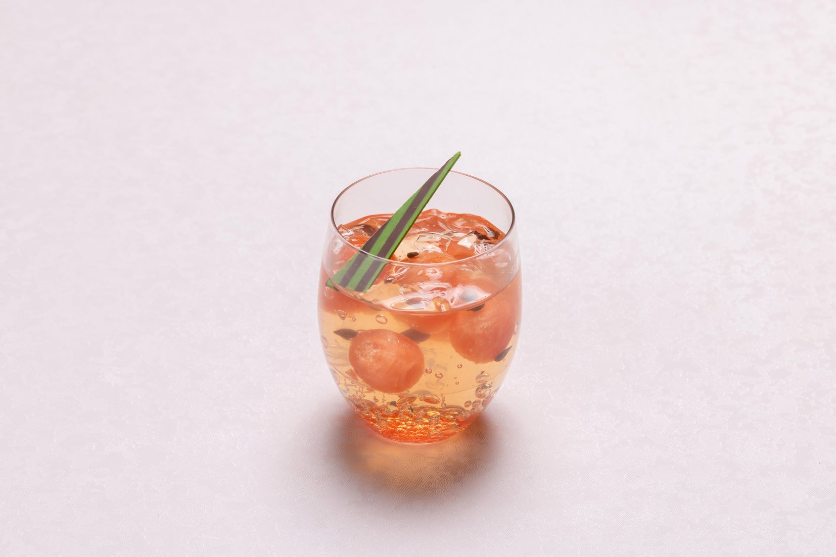 ベリーのソースの上にアップルローズのスパークリングゼリーを乗せ、その中にフレッシュなスイカを浮かべました。気泡のあるゼリーの中に浮かぶ丸くくり抜かれた赤いスイカが、まるで金魚が水槽を泳いでいるかのような可愛らしさを演出しています。チョコレートでつくったスイカの種もあしらった、シェフの遊び心満載の一品です。 *アルコール使用