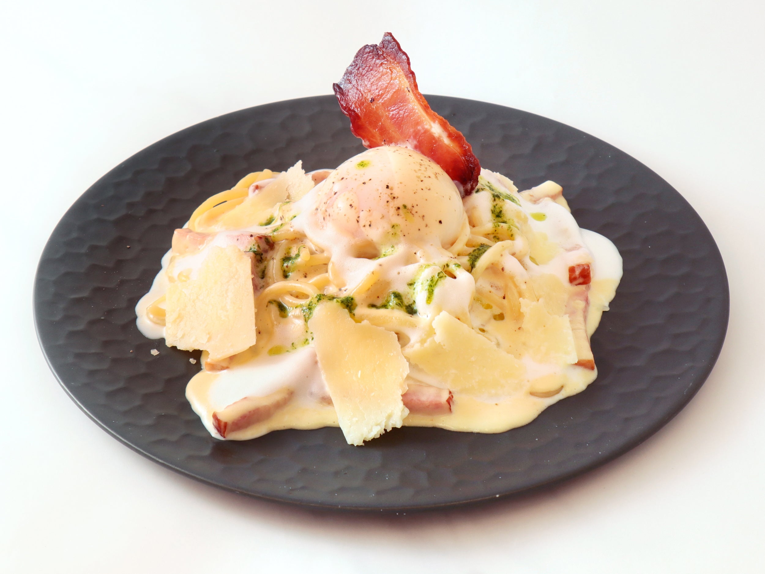 「さんなべきりやま山たまご」を使ったソースと温泉卵を添えた濃厚なカルボナーラです。