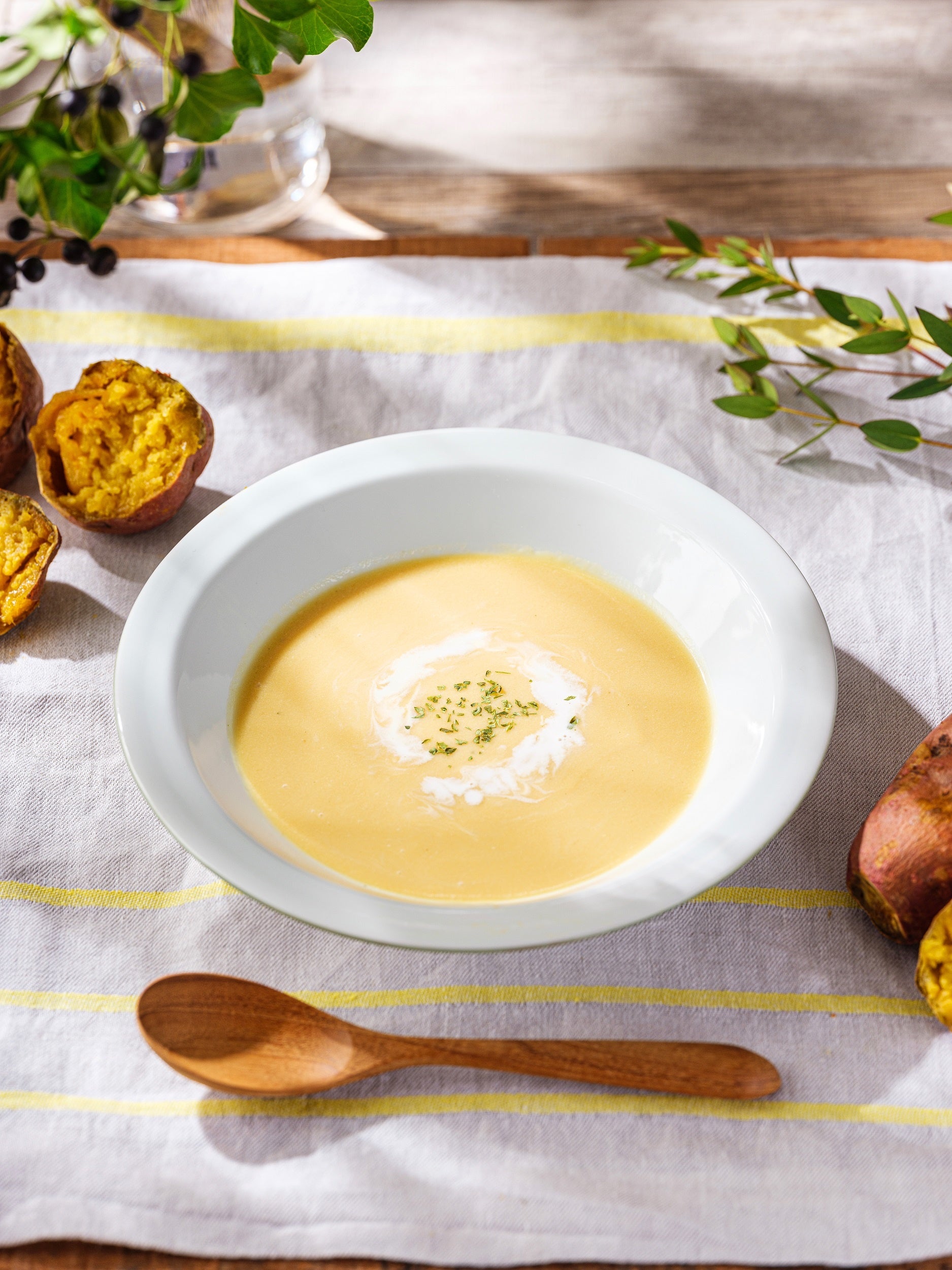 五島列島の豊かな土壌で、農薬を使わずに育てられたさつまいも「五島ごと芋」を使用した濃厚ポタージュ。収穫後に約40日熟成させ、じっくりと焼き上げることで平均糖度が36.4度と高くなった焼き芋をペースト状にして使用。さつまいものとろりとした食感とやさしい甘口の味わいが特徴です。1日の始まりに目覚めの1杯としてお召し上がりください。