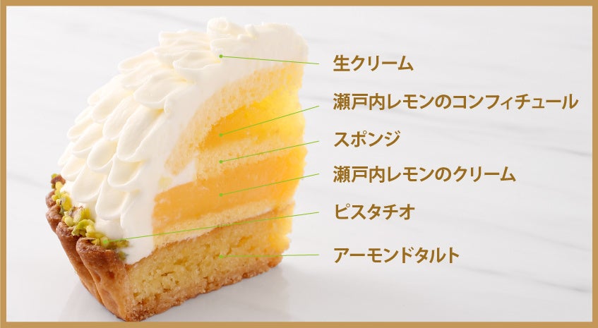 皮まで香り豊かな甘酸っぱい瀬戸内レモンの果皮と果皮を使ったとろける口当たりのレモンクリームとレモンのコンフィチュールを、香ばしいアーモンドタルトに重ねました。 さらに生クリームをドレスのように 寧な手技で丁寧にしぼり、レモンの果汁をじっくりと煮詰めて作るゼリーのようなパート・ド・フリュイを 添えました。