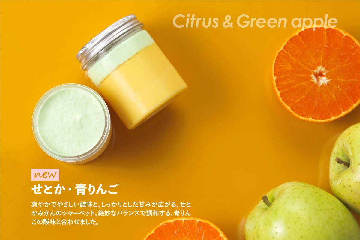 爽やかでやさしい酸味と、しっかりとした甘みが広がる、せとかみかんのシャーベット。絶妙なバランスで調和する、青りんごの酸味と合わせました。