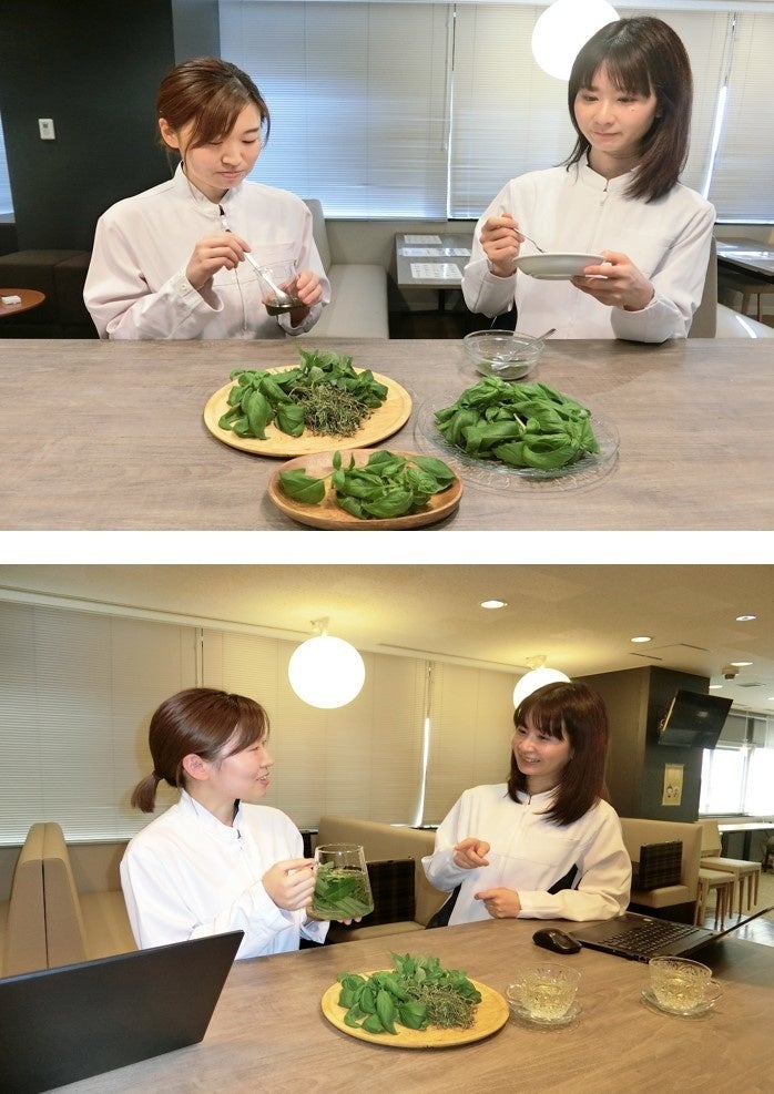 着想のきっかけは、市場調査&試食にでかけた際に立ち寄ったお店で飲んだ“一杯のハーブティー”でした。「バジルもハーブの一種、バジルのお茶ができたら面白いかも、そういえば煎茶はお茶の香り高い特徴をもちつつ保存がきく、この考えはバジルに応用できるかも!」そこからバジルの加工に日本茶の製法を取り入れる試みがスタート。実際に京都や静岡に行き、お茶作りを体験したり、お茶工場を見学しました。お茶の素晴らしい風味がどう形成されていくのか、またお茶作りの丁寧さ・こだわりに触れたことは、この後の開発に非常に影響を与えました。