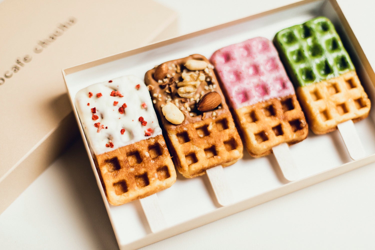 ※トースターで30秒〜1分ほど温めると、焼き立てのようなワッフルの風味を楽しんでいただけます。(チョコがディップしてあるワッフルはアルミホイルを敷いて温めてください。)