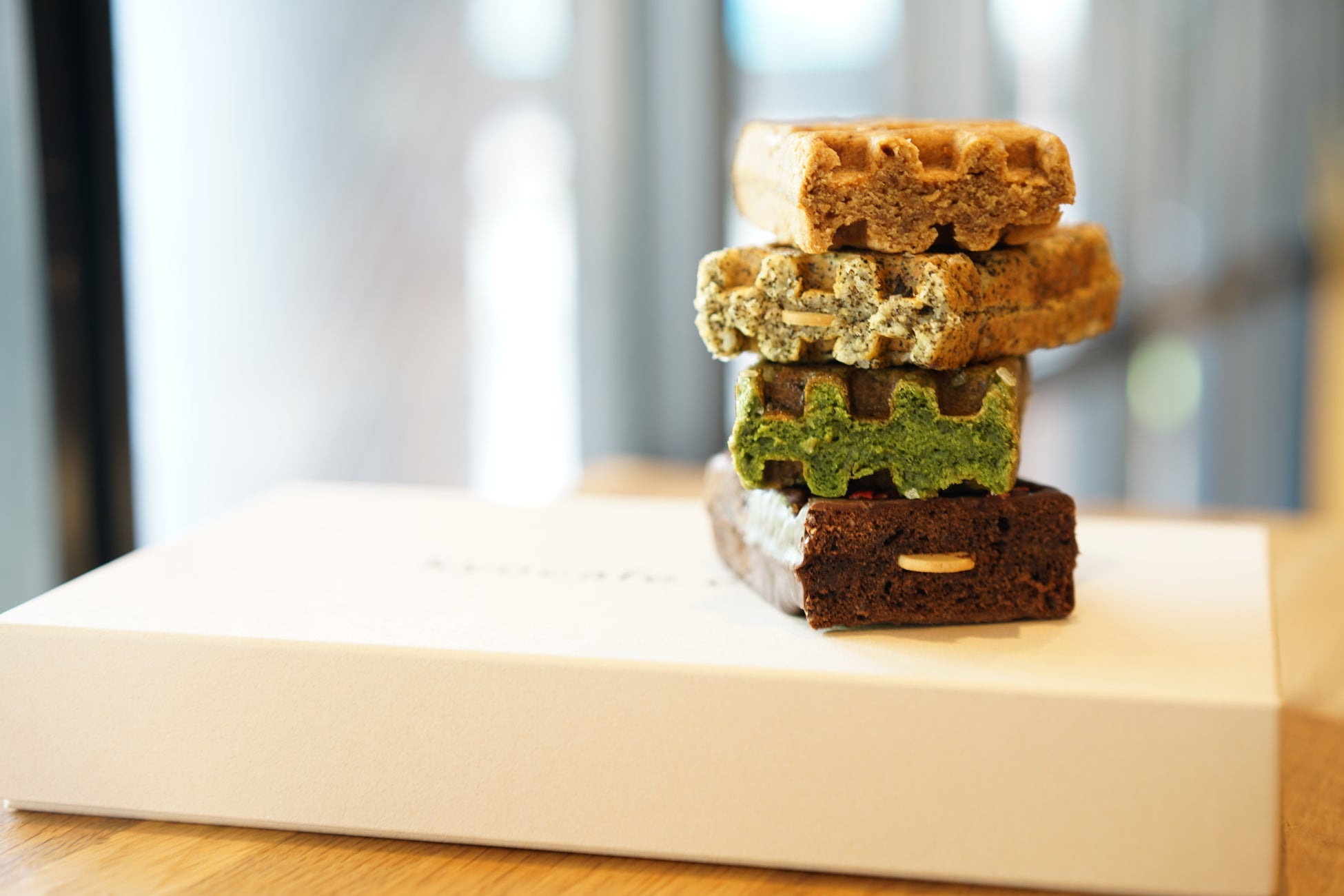 また、ビジュアルだけでなく、最後の一口まで楽しめるような食感にもこだわり、「京ワッフル」の生地には大きなザラメを練り込んでお作りしています。
