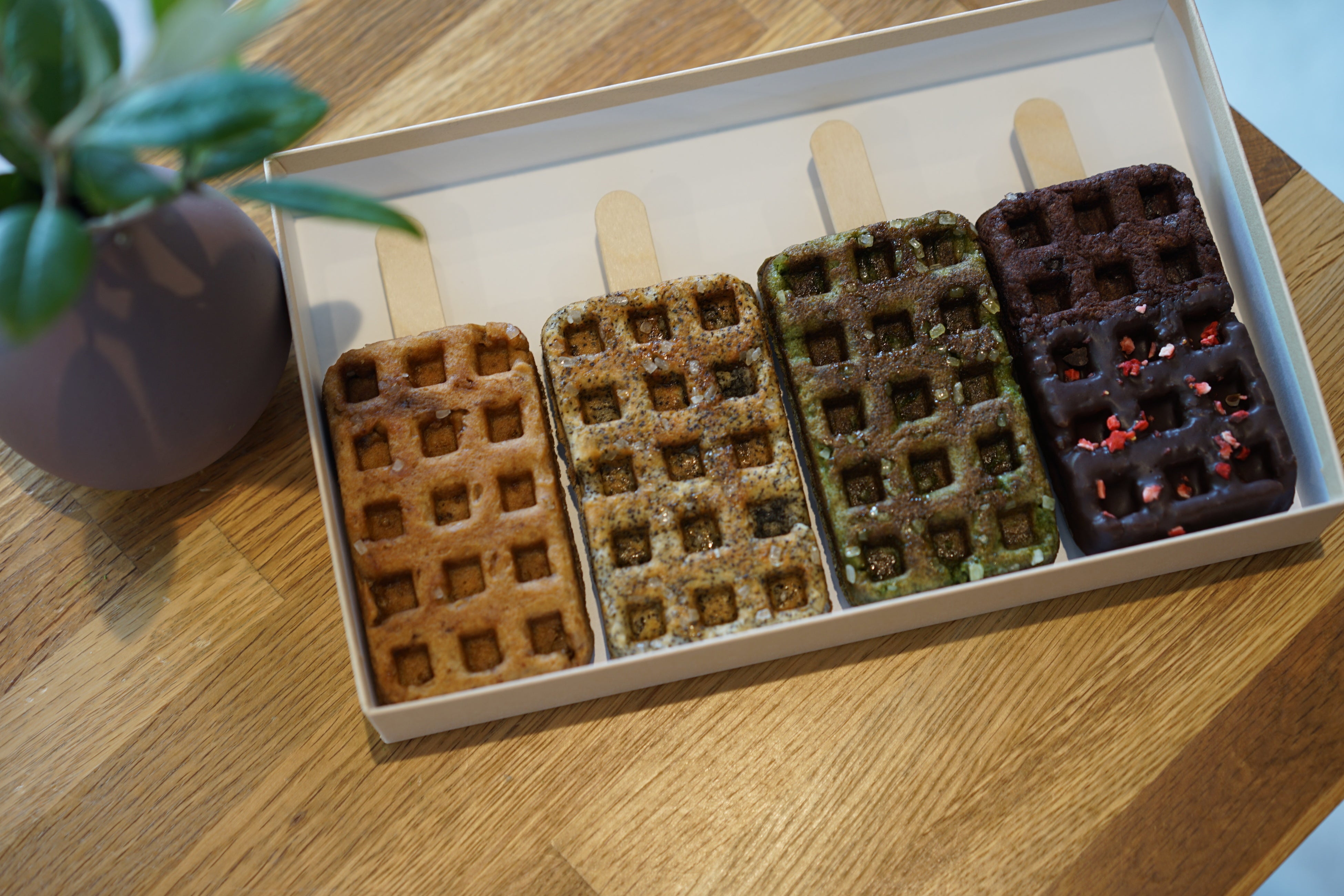 大粒のザラメを練り込んで焼き上げたワッフルに丁寧にチョコをディップ。