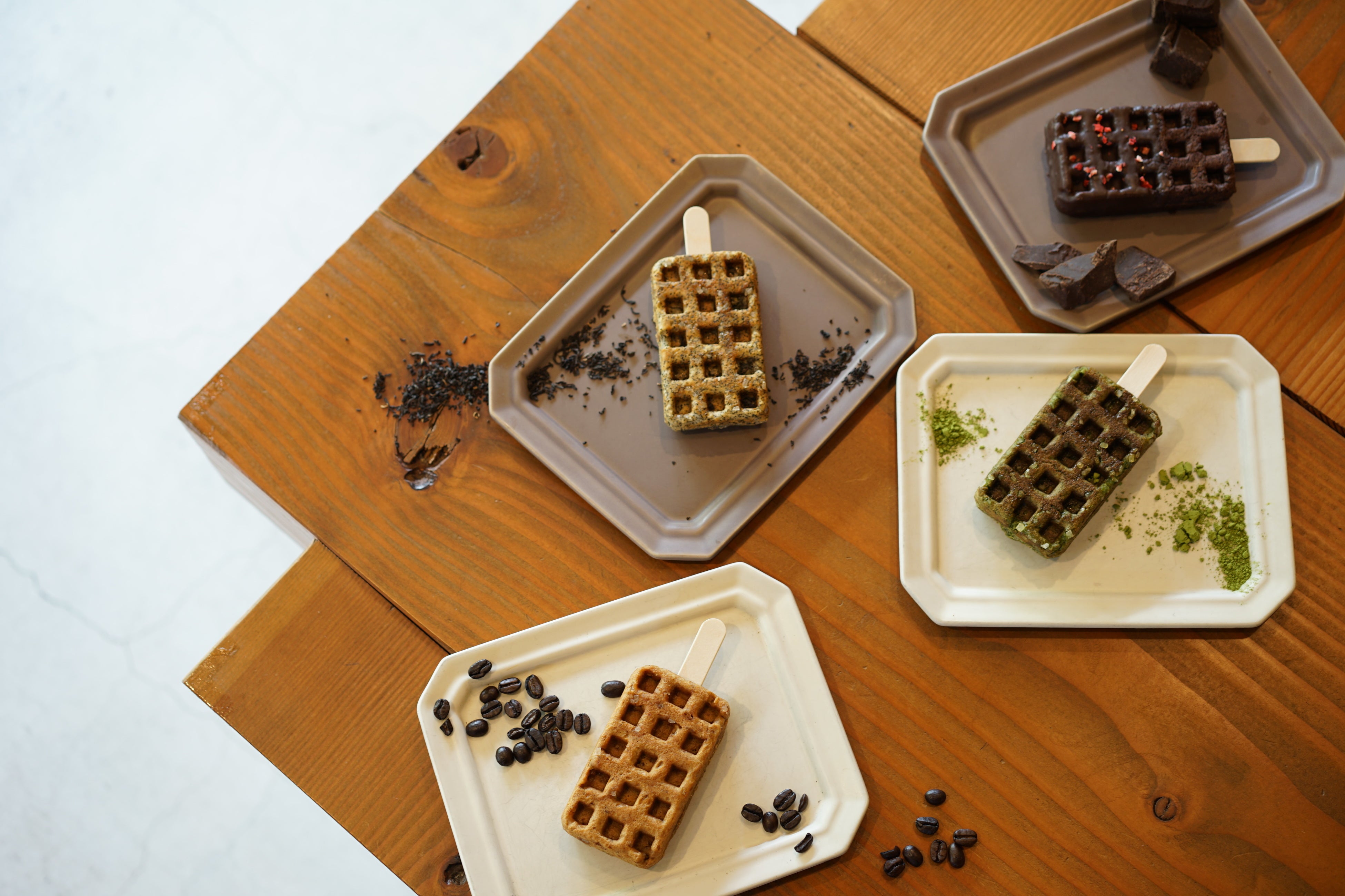 また、ビジュアルだけでなく、最後の一口まで楽しめるような食感にもこだわり、「京ワッフル」の生地には大きなザラメを練り込んでお作りしています。