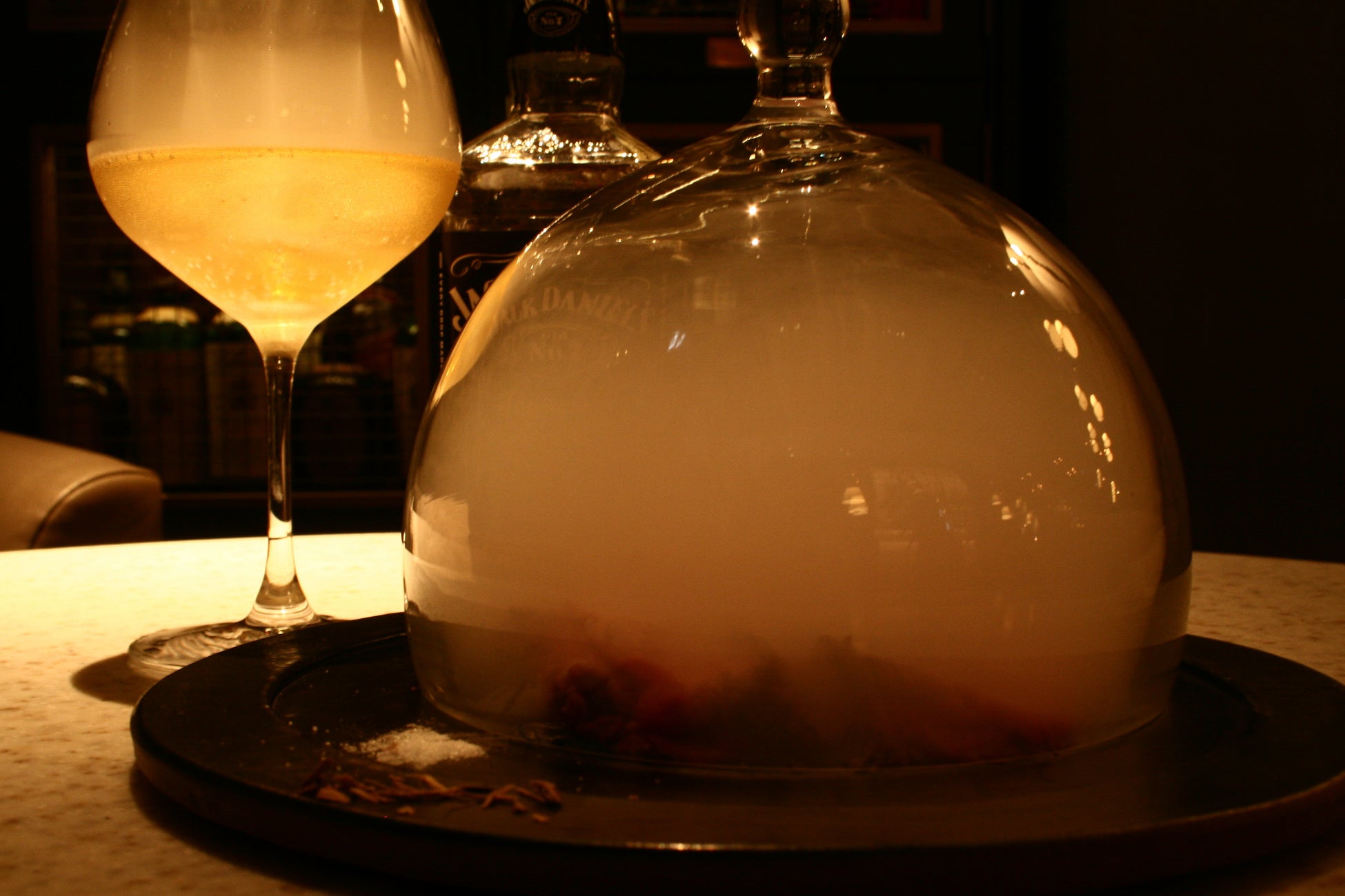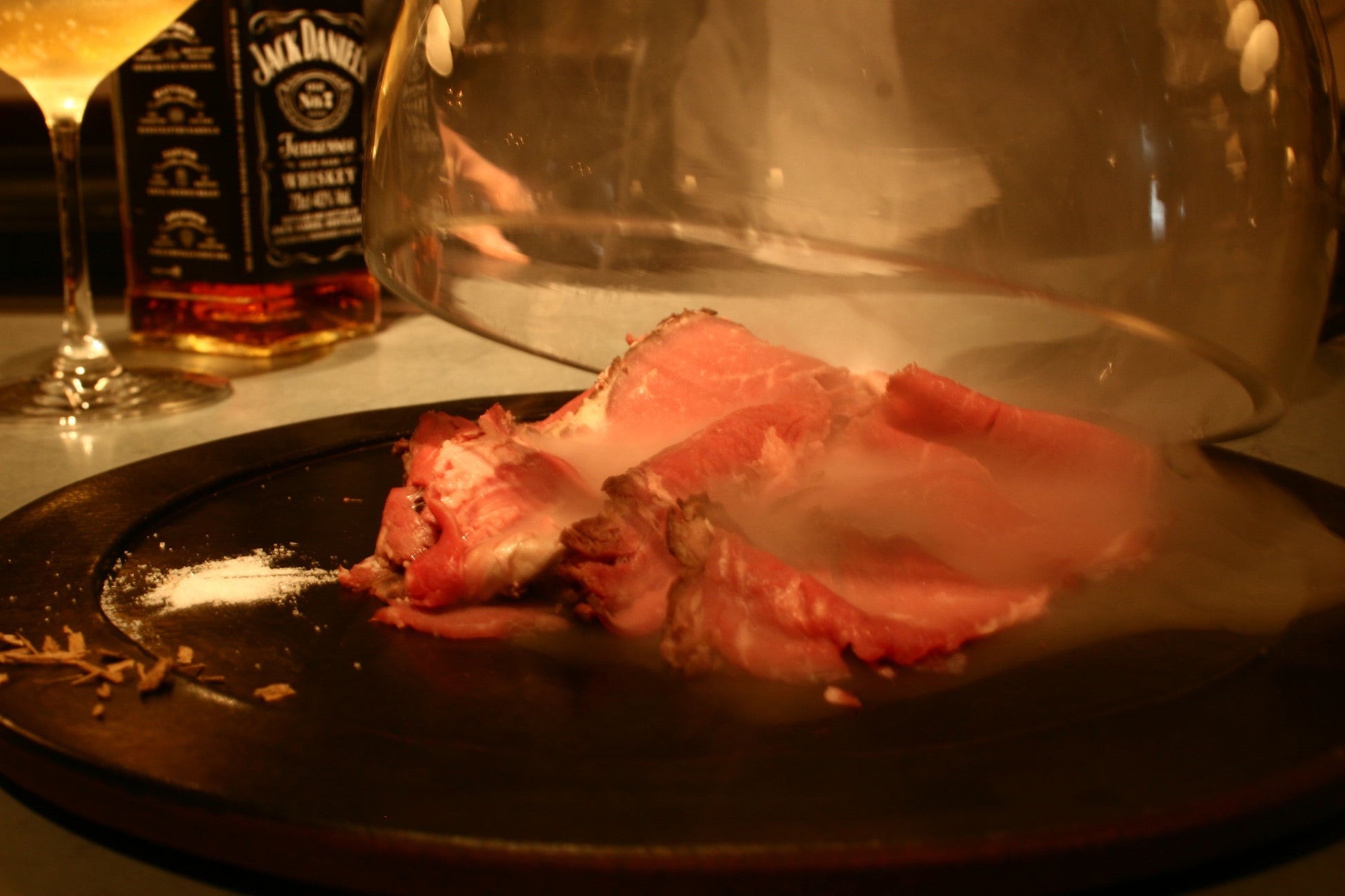 特製のスモークローストビーフに合わせるのは、同じくジャックダニエルの燻製スモークで瞬間燻製させたジャックダニエルハイボール。その場で燻製させるので、味も香りももちろん、映えも狙える燻製ハイボールは大人のBARタイムを盛り上げてくれるでしょう。