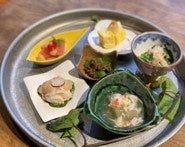 玉ねぎ皮のスープ、生湯葉・生うにべっこうあんかけ、刺身3種盛り合わせ、京橋おばんざい6種盛り、甘鯛若狭焼き、アスパラ、そら豆、国産黒毛和牛ロースたたき、セルクル寿司、デザート