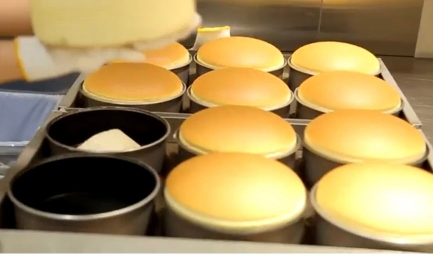↑<りくろーおじさんの店>焼き立てチーズケーキ(6号18cm)税込765円 1日12個ずつ/1釜・10分置きに焼いて出来立て提供を続けています。
