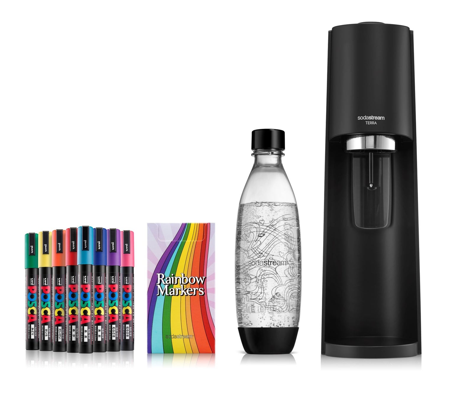 プライド月間を記念して限定販売される「Set All Your Colors Free」は、マットブラックの「TERRA」と、スペシャルデザインのボトル、レインボーカラーのマーカー8色(赤、オレンジ、黄、緑、青、水色、紫、ピンク)がセットになっており 、マシンに自身のプライドストーリーやイラストを描いて、マシンとボトルをオリジナルにカスタマイズすることができます。