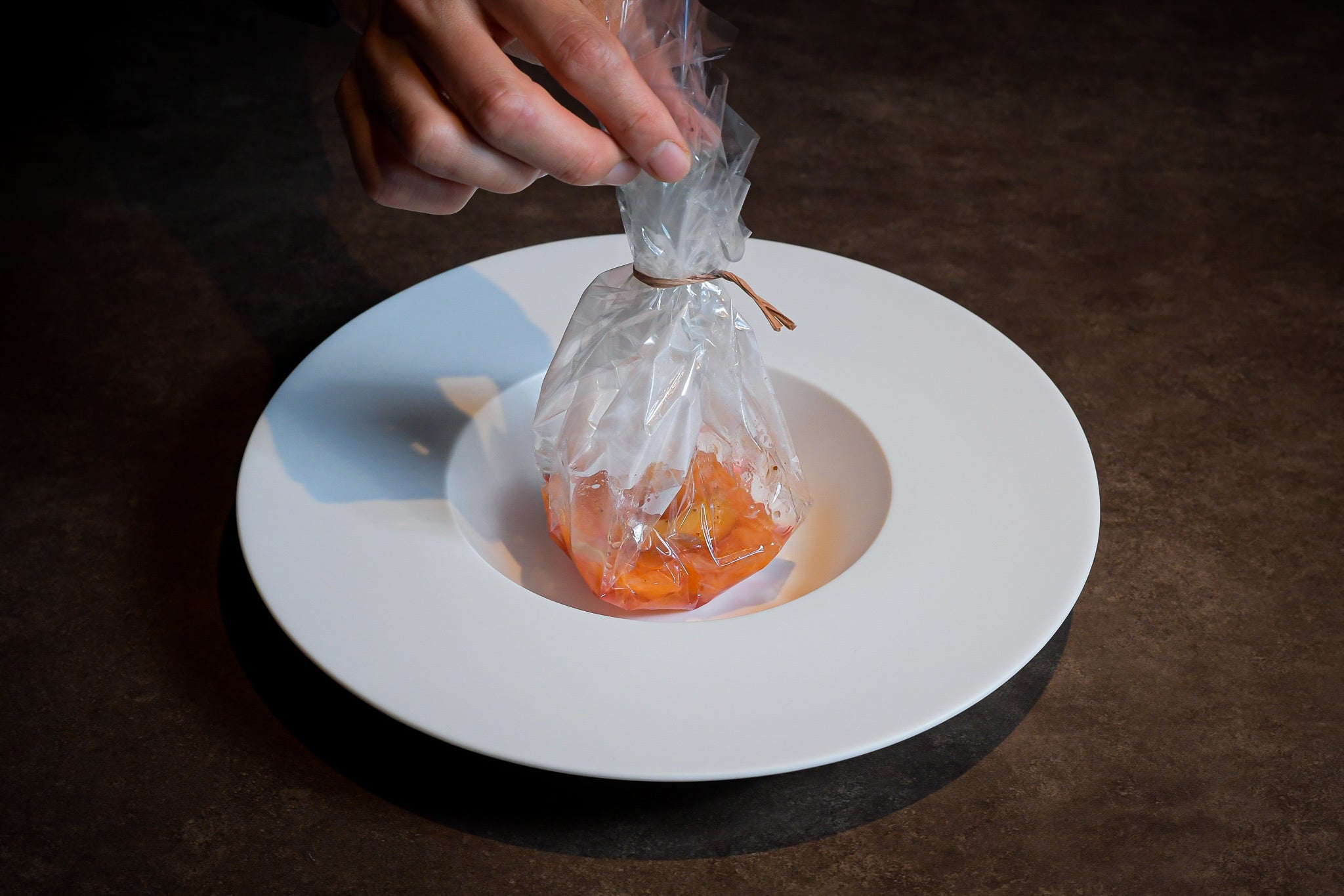 バラの香りと味わいをしっかりと感じられるデザート「芳(ほう)」。構成はプラムのシードルコンポート、プラムエキス、バラエキスの液体窒素アイス、バラの花弁。嗅覚からくるバラと、味わうバラの2つのバラ体験をお楽しみいただけます。香りの設計は、オーバナイトセーションのシャープな香りを始めに感じ、徐々に香りのボディが膨らんでいき、最後はプラムの余韻と共に消えていくイメージで作りました。ペアリングには「眠姫」。プラムのような香りがする日本茶を合わせます。新茶の青葉アルコール特有のフローラルな香りと、初夏のフルーツのジューシーさを主軸に構成した6月のデザートコースの中でお楽しみください。