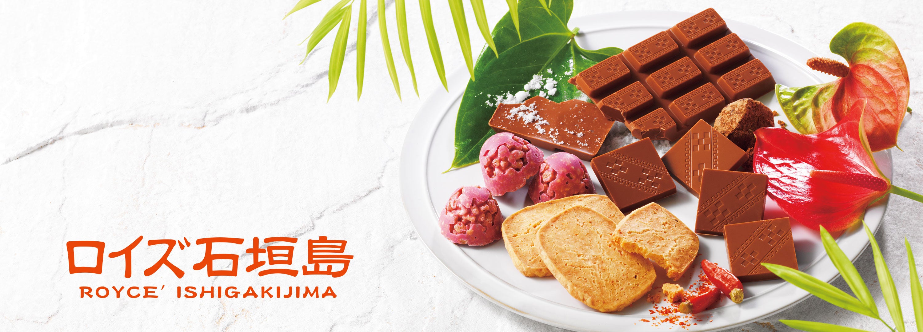 北海道のロイズが、石垣島をはじめとする沖縄の豊かな自然に恵まれた魅力ある世界と出会い、インスピレーションを受けて誕生したのが「ロイズ石垣島」。沖縄の素材を使い、南国のエネルギーに満ちたおいしさを、ロイズならではのレシピでチョコレートや焼き菓子に仕上げました。