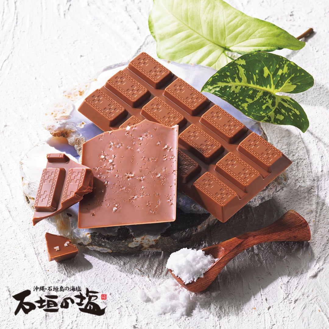 「石垣の塩」をミルクの風味豊かな板チョコレートの底面に散りばめました。旨みのあるまろやかな塩味がぱっと広がり、チョコレートの甘さとゆっくりとけ合います。