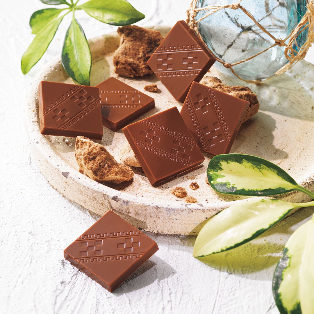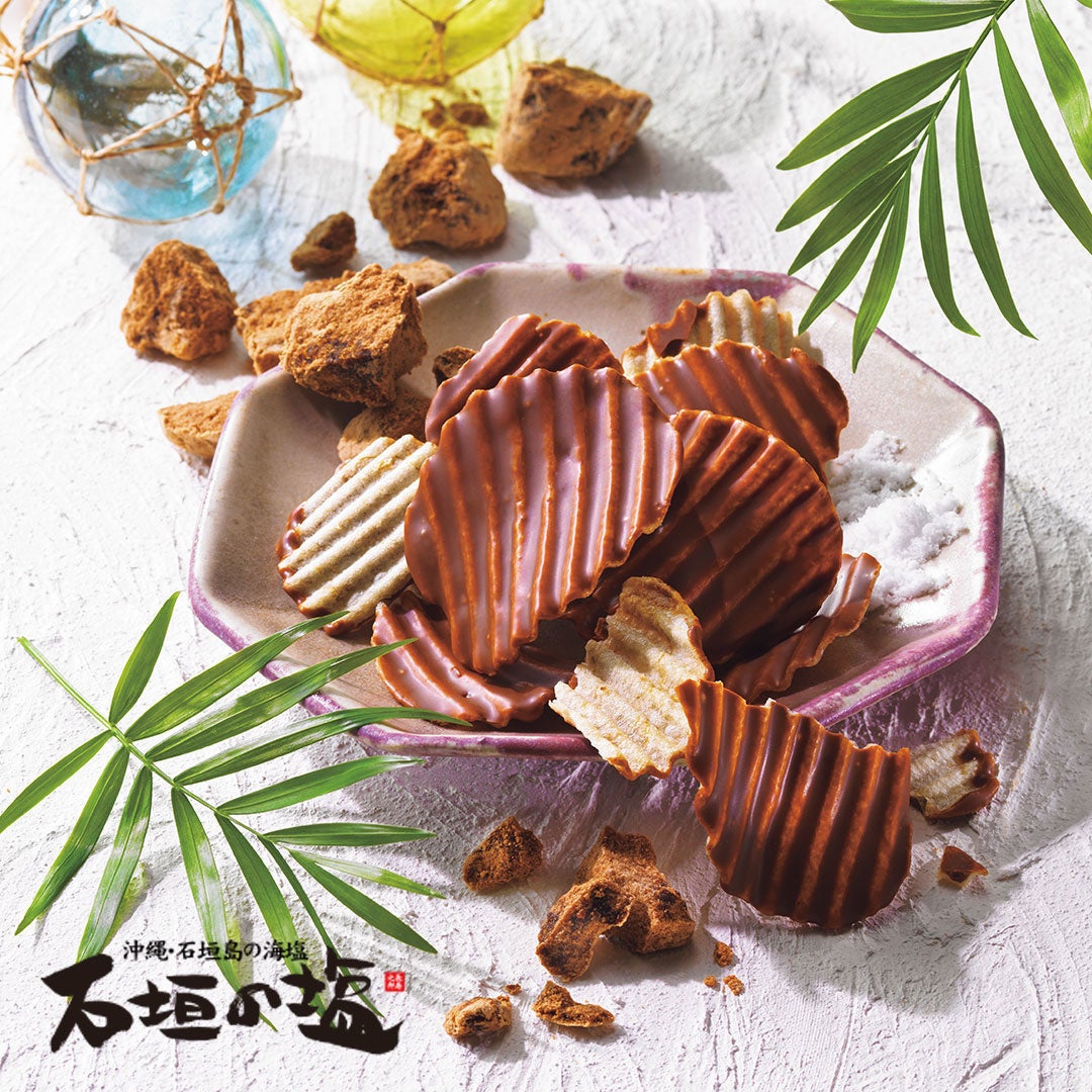 石垣の塩を効かせたポテトチップの片面に、沖縄県産黒糖とキャラメルの風味がとけ合うチョコレートをコーティング。まろやかで旨みのある塩味がポテトチップの軽やかな食感とともに広がり、黒糖とキャラメルが香るチョコレートのやさしい甘さととけ合います。