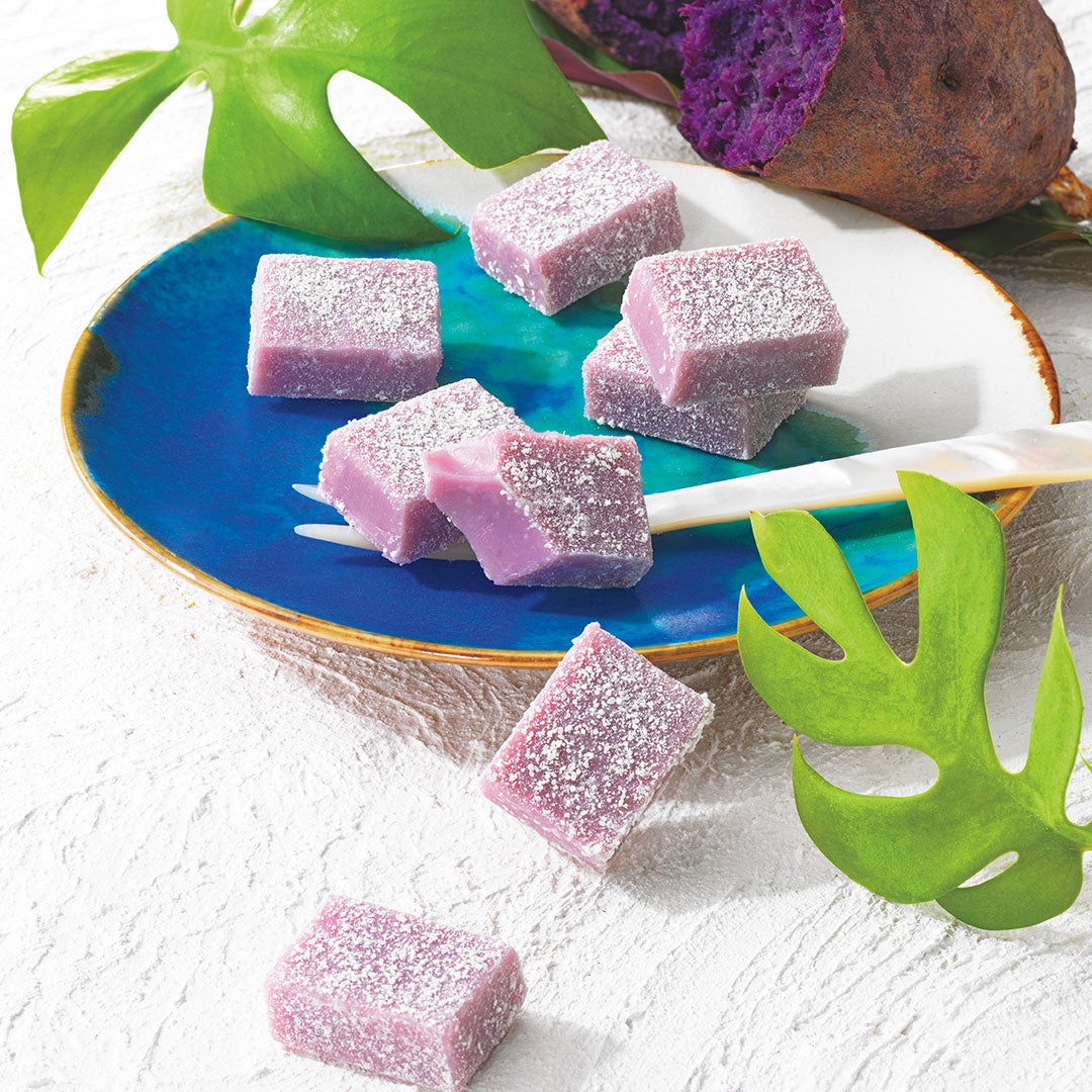 紅いもパウダーをブレンドしたホワイトチョコレートに、紅いもペーストを加え、沖縄県産紅いもを使用した芋焼酎で風味付けしました。紅いもと生クリームが混ざり合った、柔らかな紫色が美しい生チョコレートです。