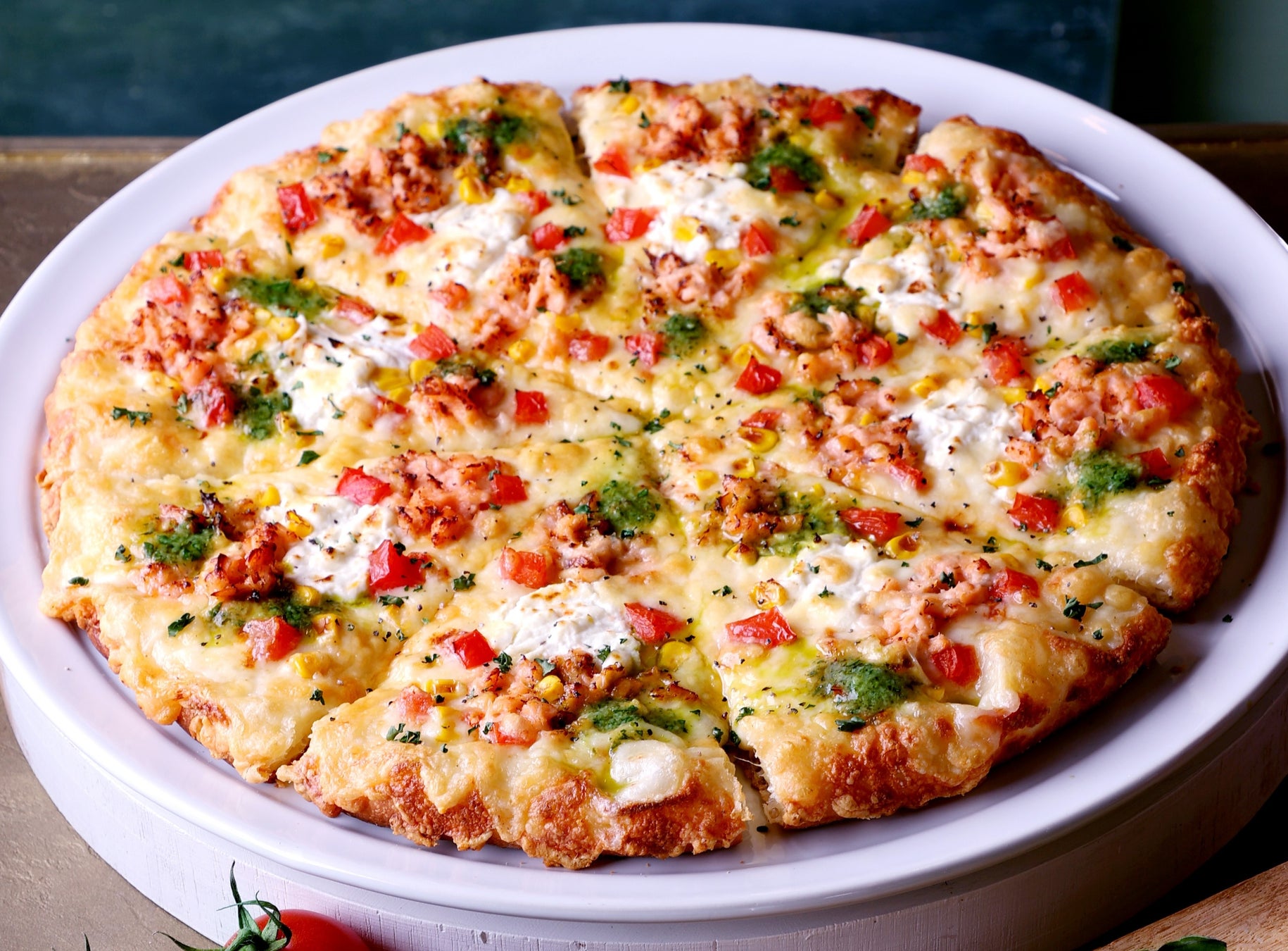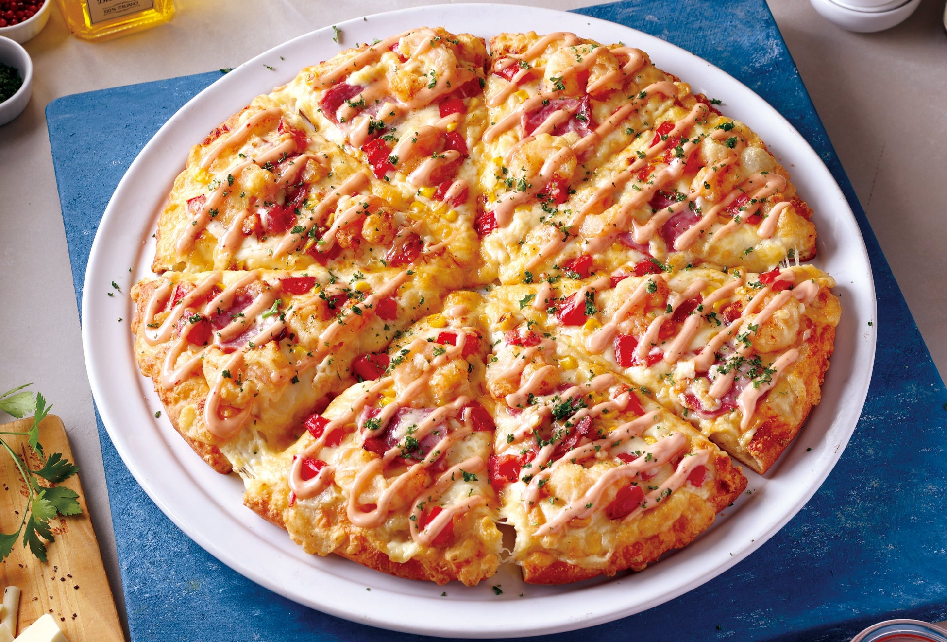 プリッとしたエビをふっくらとした衣で包んだエビフリッター、エビに絡まるマヨネーズの旨み。さらに、特製オーロラソースのコク・ほのかな甘みと酸味が、味わい豊かにピザを彩る、お子様から大人まで幅広い世代の方々に愛されている商品です。