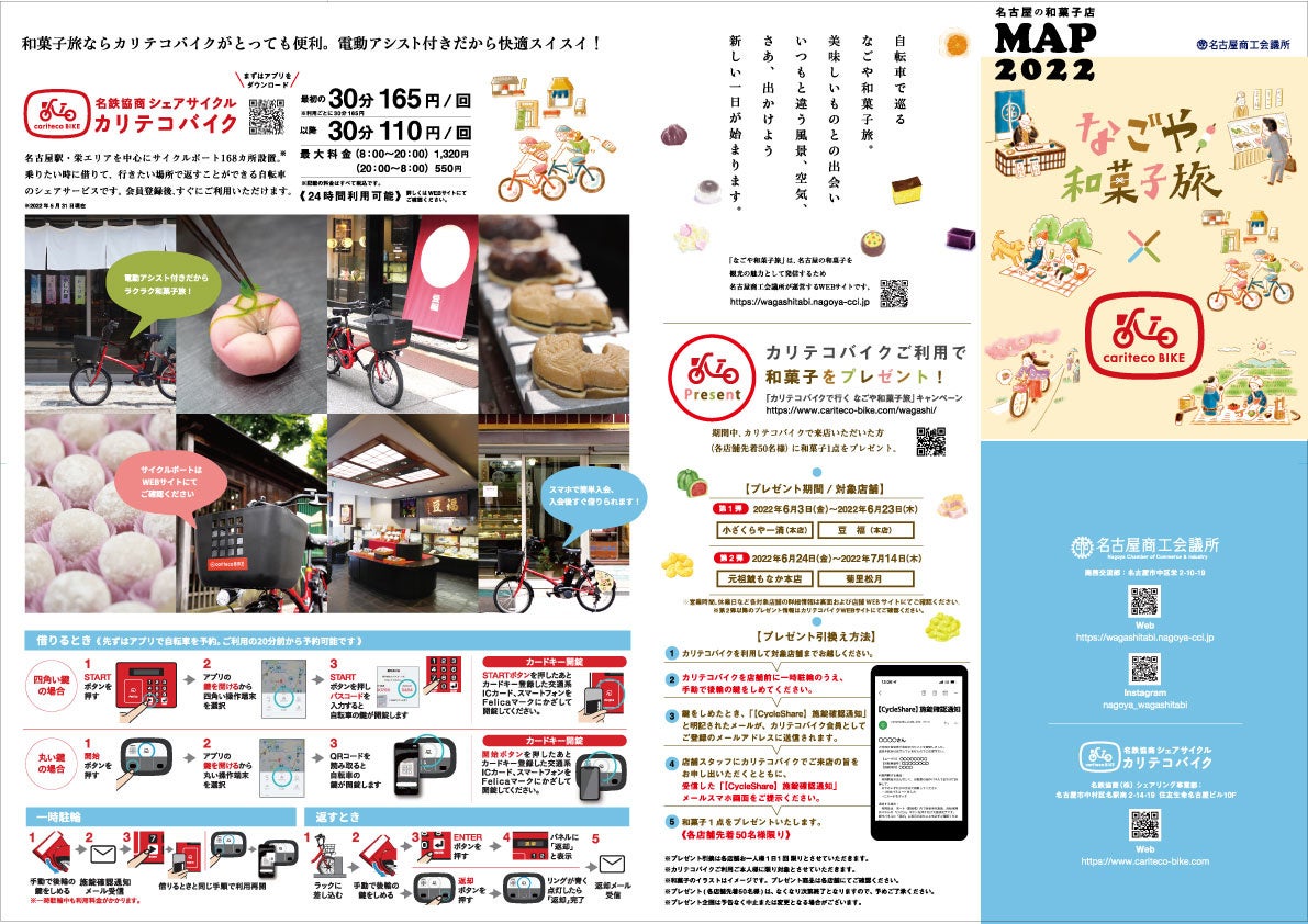 そうしたなか、会報誌2022年1月号の特集「なごやの和菓子のはなし」にて、当プロジェクトとの連携を観光産業事業者や行政・観光団体に呼び掛けたところ、「名鉄協商株式会社」より自転車のシェアリングサービス「カリテコバイク」との連携提案があり、事業を検討して参りました。