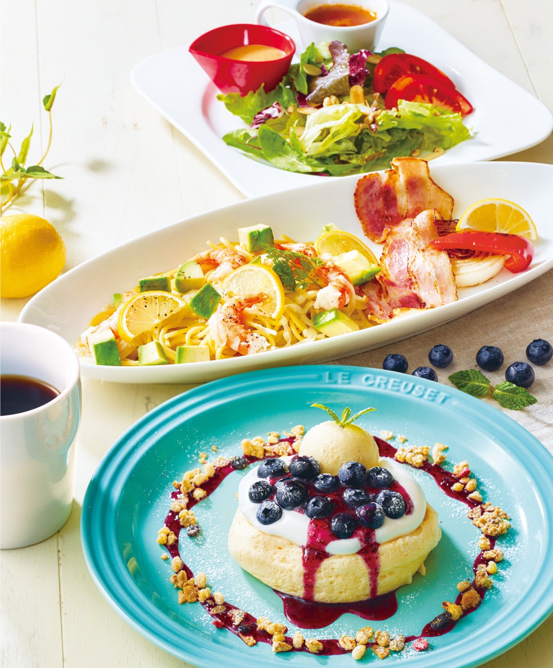 フレッシュサラダ&ミネストローネスープ・海老とアボカドの塩レモンパスタ・フレッシュブルーベリーのパンケーキ(ハーフ)・選べるドリンクのセット。「むさしの森珈琲」が丸ごと楽しめる全4品のコースです。