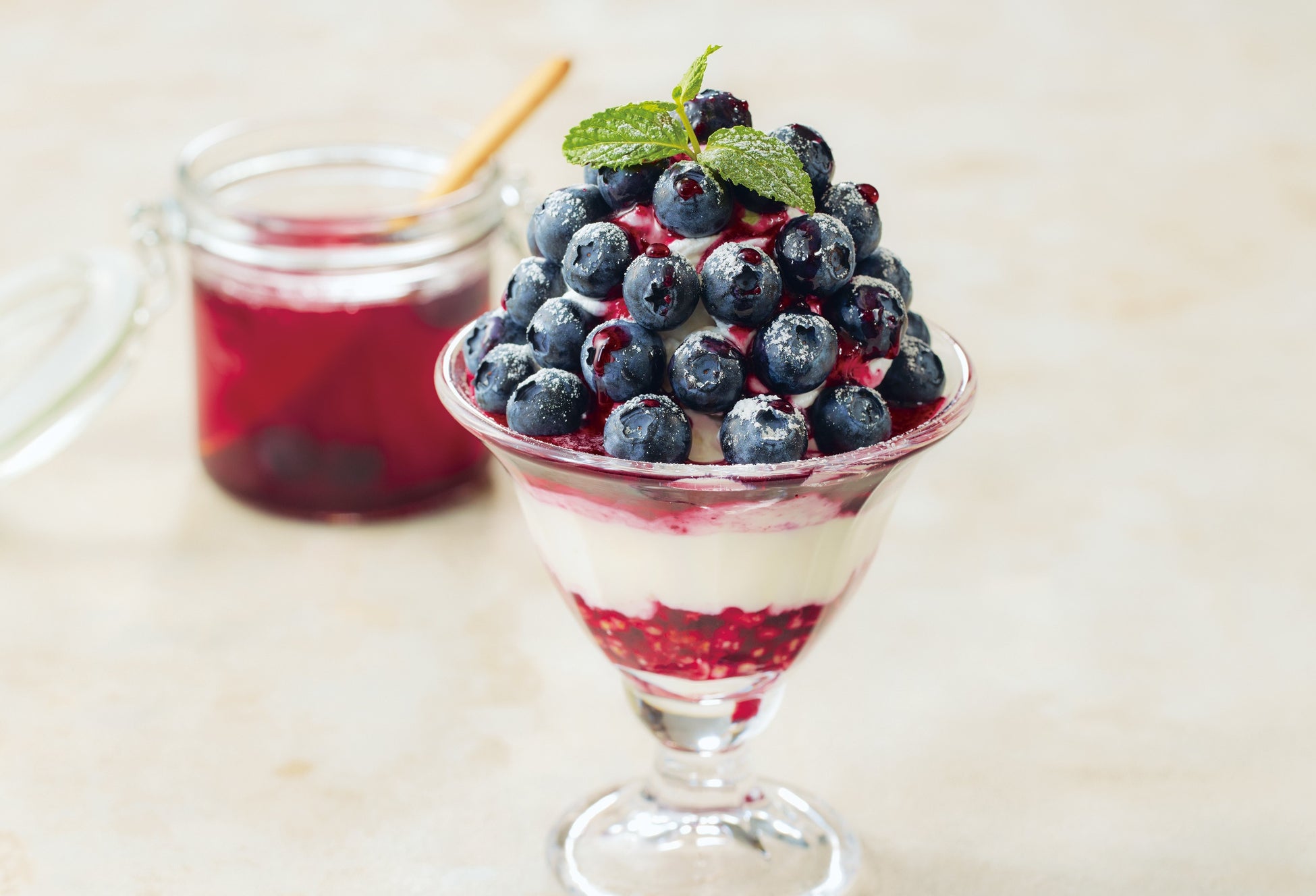 ヨーグルトに約80gのごろごろフレッシュブルーベリーと、濃厚なブルーベリーソースを合わせた爽やかなパフェです。