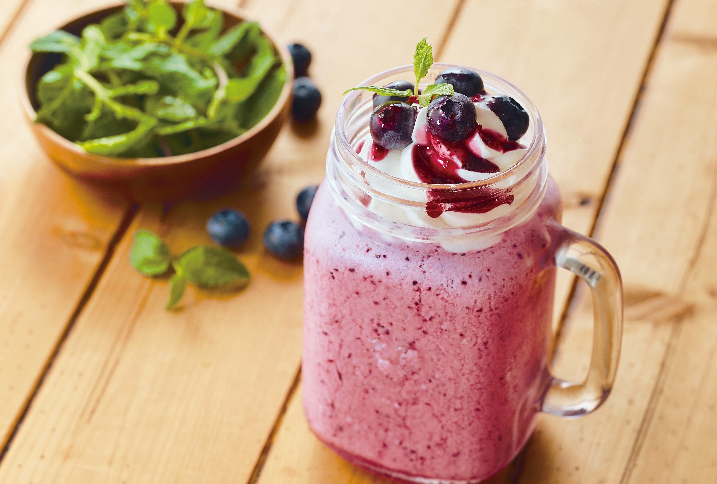 ヨーグルト、フレッシュブルーベリー、ブルーベリーソースを合わせた、甘酸っぱくてなめらかな、ひんやりスムージーです。