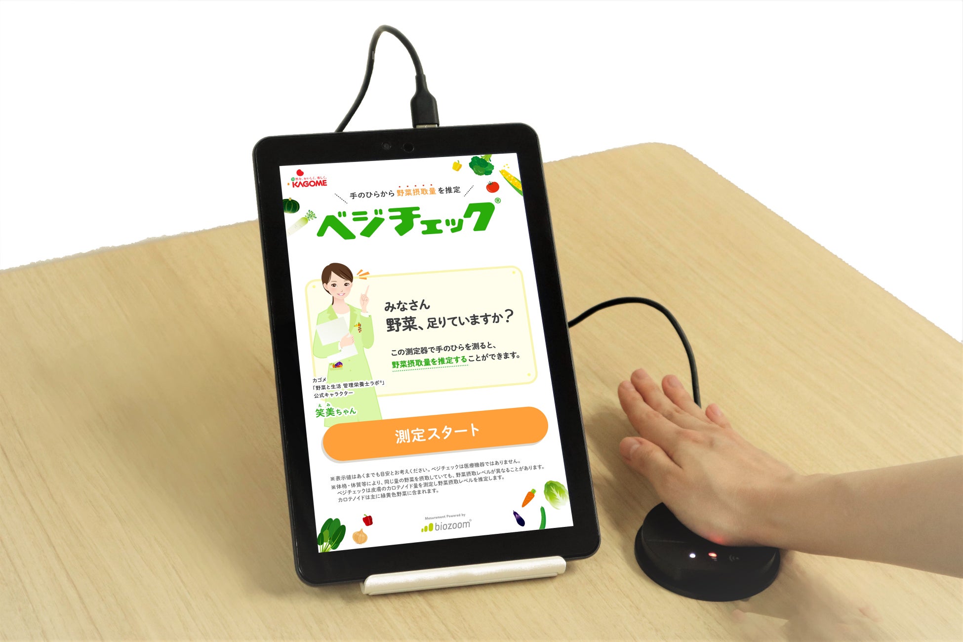 センサーに手のひらを当てるだけで野菜摂取量を推定できる機器です。推定野菜摂取量を表示することで、野菜不足や食生活の改善を促します。