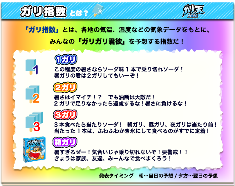 「ガリ指数」とは、各地の気象予測データをもとに、皆さまの「ガリガリ君」欲の上昇を予想するものです。