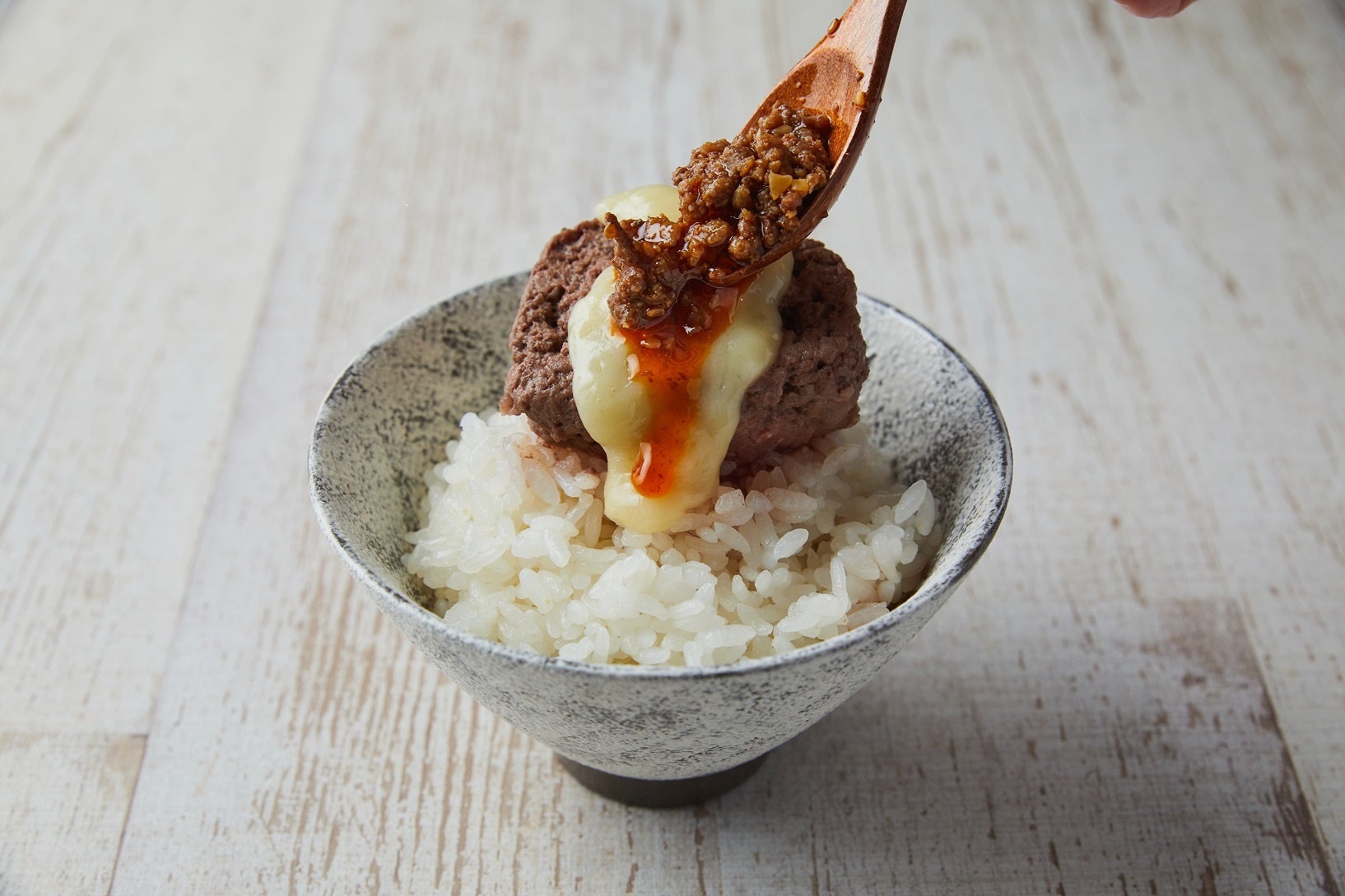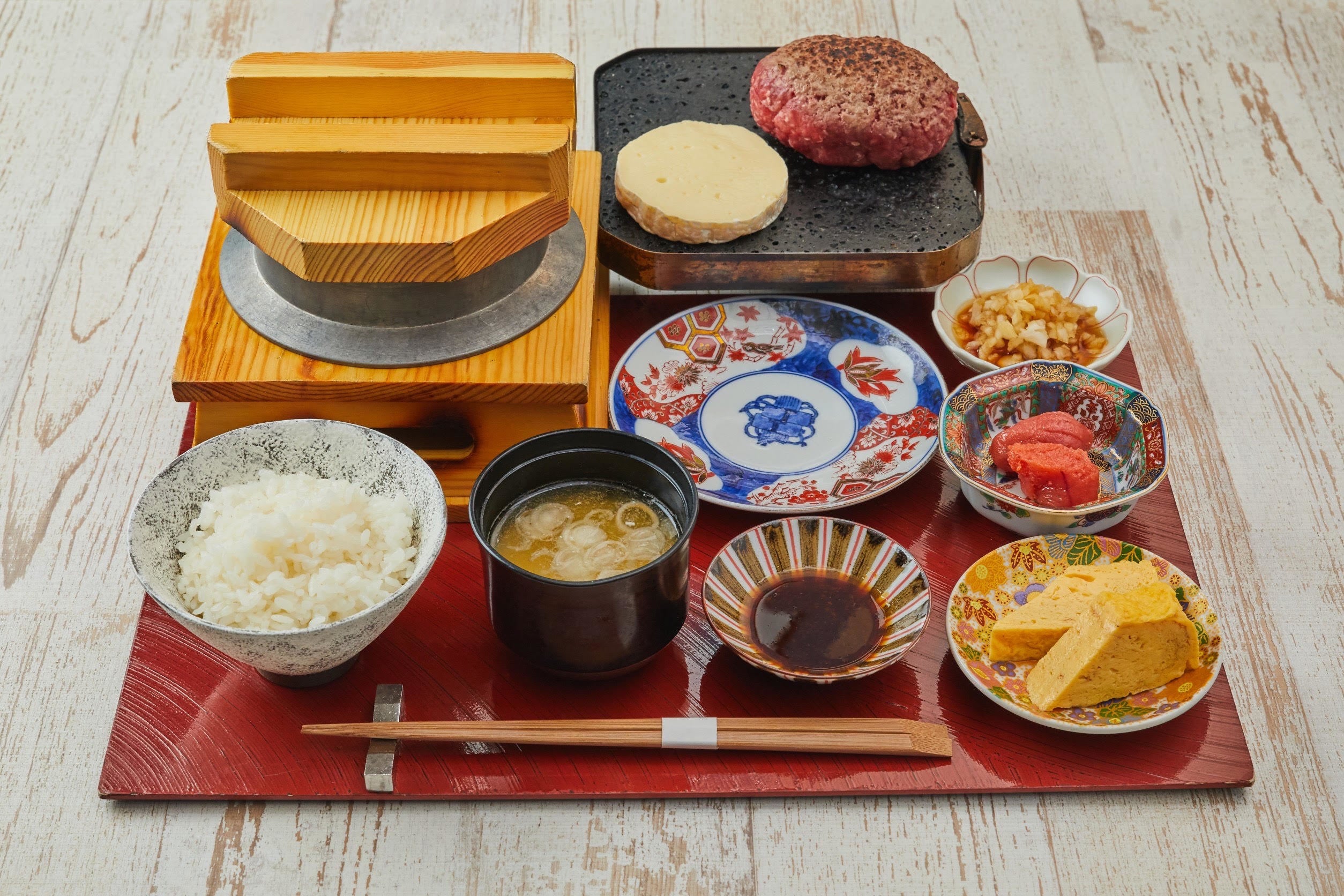定食に欠かせないお米は、『釜元たん米衛』と同じく、京都の老舗米屋「八代目儀兵衛」が選び抜いたブレンド米を使用し、注文が入ってから釜で炊き上げるため、味の濃さ・香り・ツヤはいずれも格別です。メインは、開発に半年以上を費やしたドライエイジングを施すことで旨味を凝縮させた「熟成和牛レアハンバーグ」です。黒毛和牛を3週間以上ドライエイジングした熟成肉を使用したハンバーグは、表面を焼きつけた後、中はレアの状態で提供します。テーブルに備え付けた溶岩プレートでお客様のお好みの焼き加減に焼き上げることができ、食べ終わるまで温かく、柔らかいハンバーグを堪能いただけます。ソースは、 『釜元たん米衛』でも人気の自家製「食べるタンラー油」、「食べる醤油」の他、オリジナル醤油ベースの程よい甘さのステーキソースなどをご用意します。また、定番の「熟成和牛レアハンバーグ定食」の他に、とろ~りとろけるカマンベールチーズを絡めながら召し上がっていただく「熟成和牛レアハンバーグ&とろけるカマンベールチーズ」もご用意しました。ハンバーグのサイズは180g、210g、240gと3種類あり、追加で30gづつ注文もできるので子供から女性、男性問わず対応可能です。