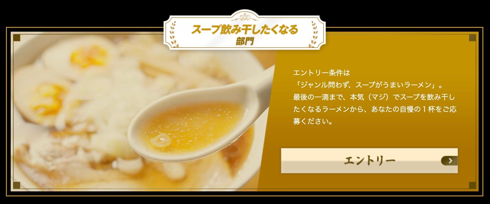 ※エントリー条件は「ジャンル問わず、スープがうまいラーメン」。