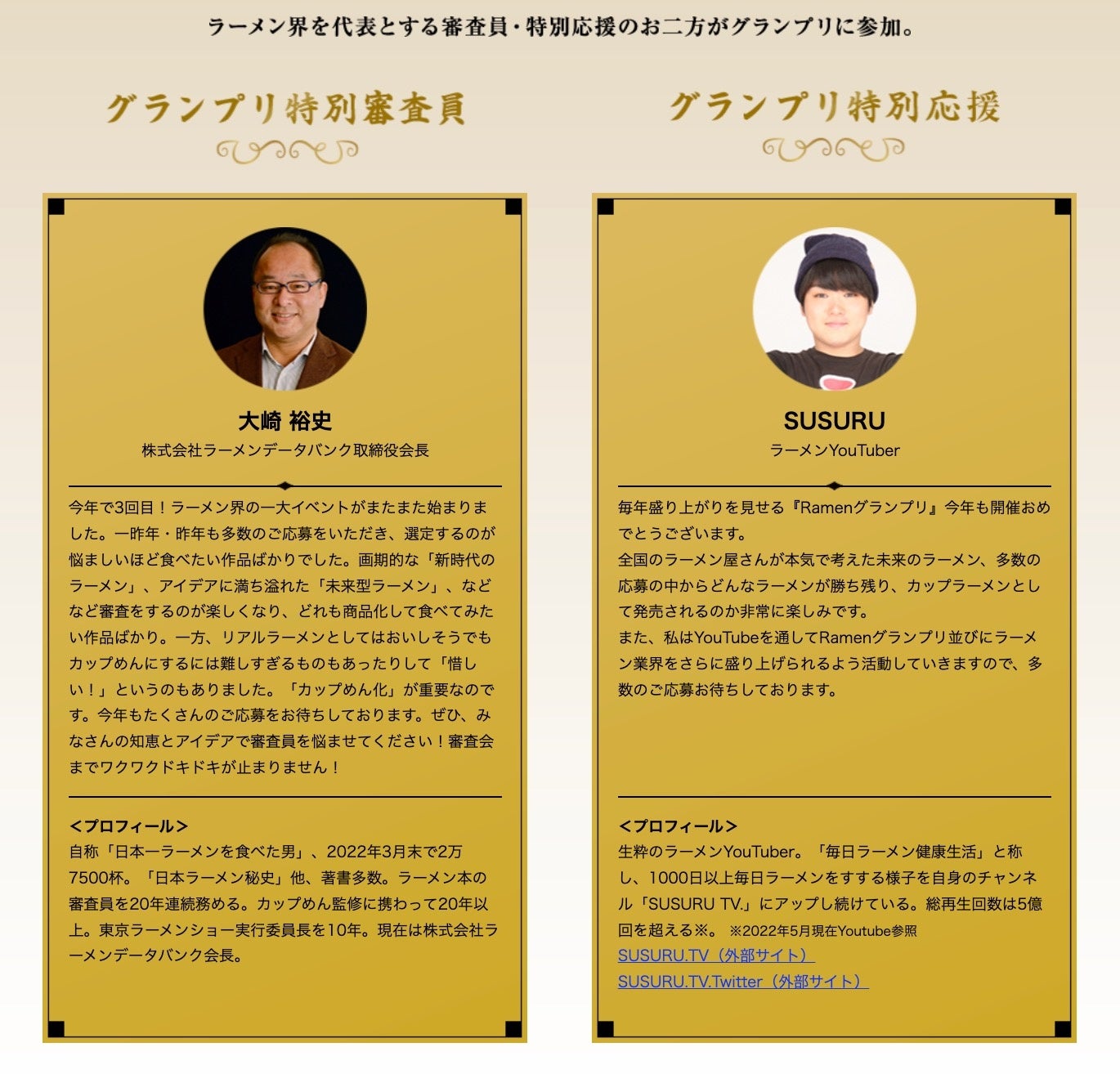 2次選考期間:2022年8月4日(木)〜8月31日(木)の間、「Ramenグランプリ2022-2023」公式ホームページ上にて一般のお客様による投票を行います。その他に、Twitterからも投票が出来ます。