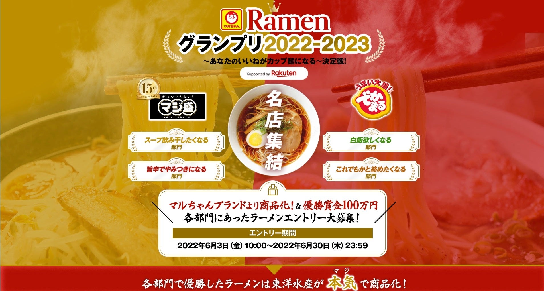 2022年、おいしいラーメンが家でも食べられる時代になったいまだからラーメンファンの 「食べてみたい」を叶えたい。そんな「食べてみたい」と思われるラーメンを4部門(ジャンル)で大募集! 応募されたラーメンの中から各部門5店舗を審査会で選出し、一般投票で優勝店舗を決定します。 各部門の優勝店は賞金100万円が授与され、ラーメンはカップ麺として商品化、発売されます。